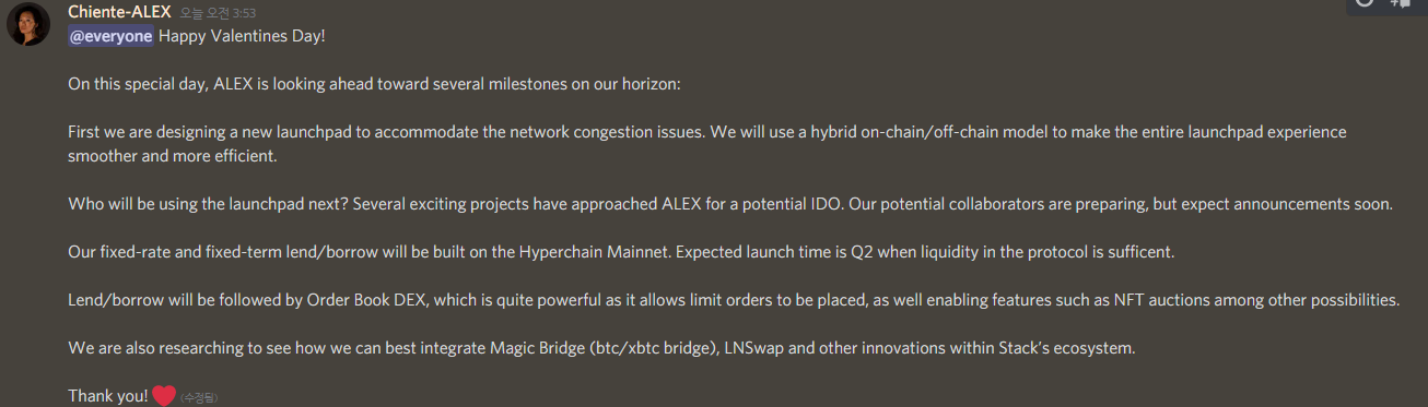 알렉스(ALEX) 디스코드에 2/15일 나온 공지
