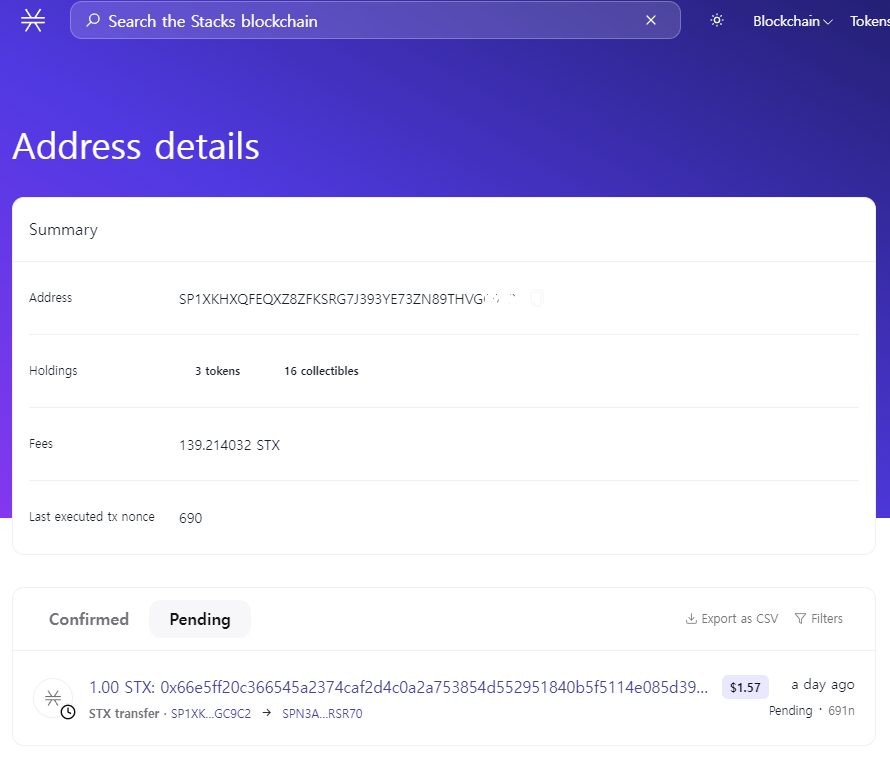 하루전에 1stx를 전송했던 필자의 트랜젝션 너무 오래 지나서 fee 증가 시키는 법으로