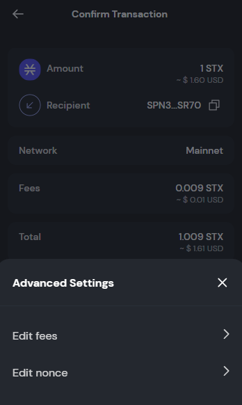 여기서 Edit fees 해서 보통 stx 전송은 기본 fee로 되지만